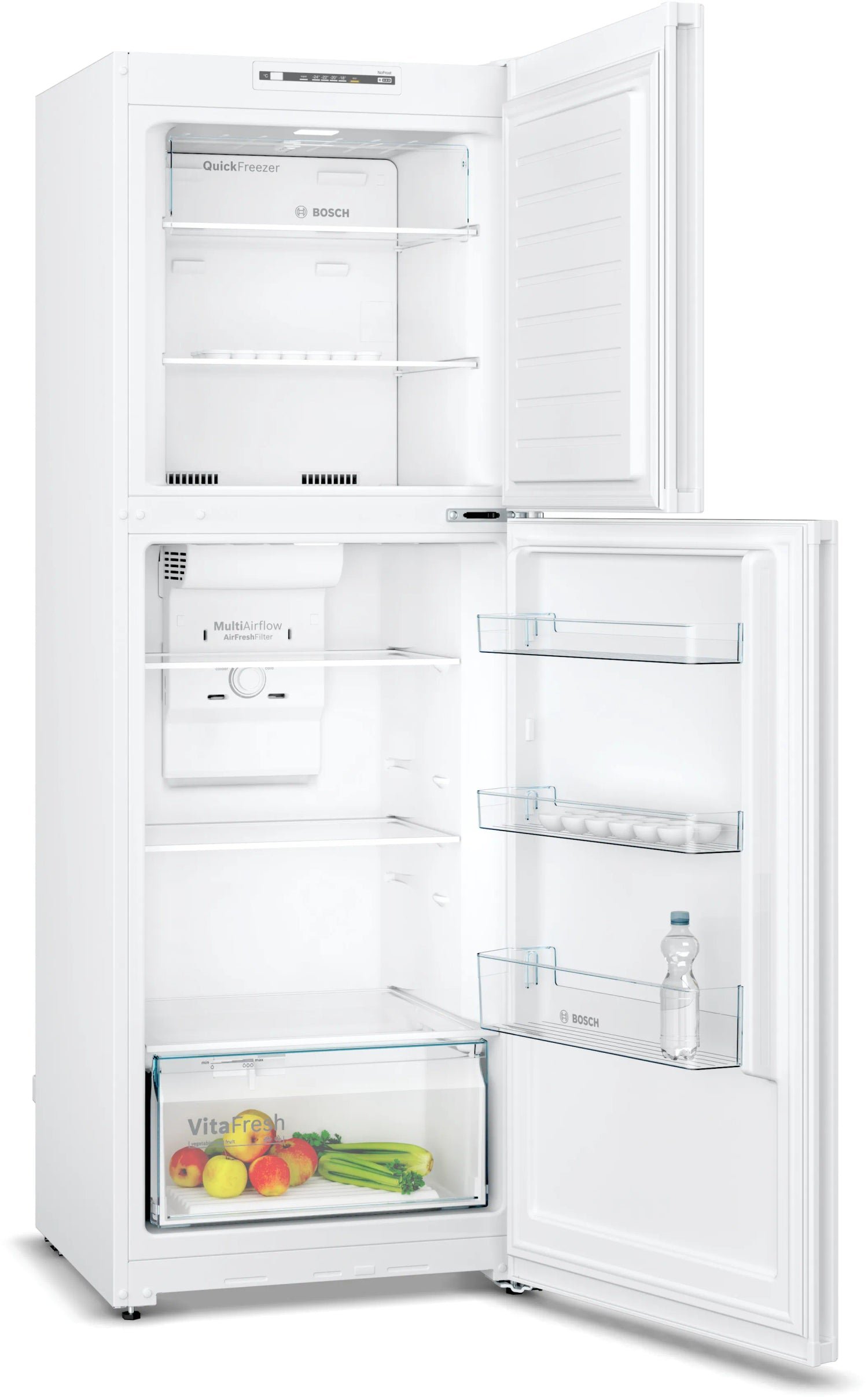• The Bosch KDN30NW20U is an exceptional freestanding fridge freezer that combines style with functionality. Designed to meet the needs of modern kitchens, it offers ample storage space for your groceries with an efficient cooling system to keep your food fresh longer. The fridge is equipped with easy-to-clean shelves and a large freezer compartment. Its energy-efficient design helps reduce electricity bills while providing reliable performance. Perfect for families, this appliance ensures your food is stored in optimal conditions, preserving flavors and nutrients.
