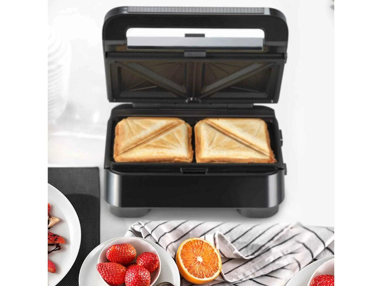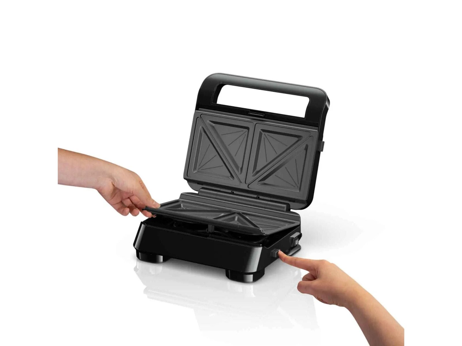 • Removable sandwich plates designed to seal in melted cheese and other ingredients.