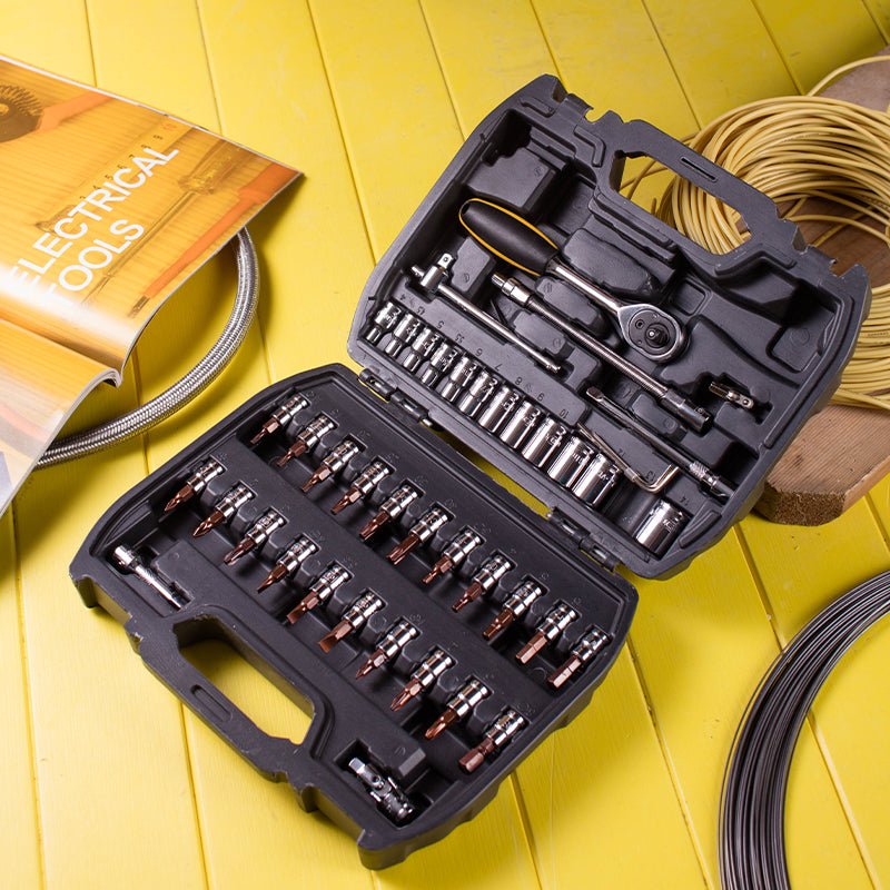 • The Deli 46PCS 6.3mm Socket Set (model EDL1046) is designed for versatility and durability. Made from 50BV30 Cr-V steel and heat-treated for enhanced strength, this set includes a wide selection of sockets, bits, and accessories, making it ideal for mining, metallurgy, shipbuilding, and auto repair. The set features a sturdy and easy-to-carry plastic box, ensuring that all components are organized and accessible.