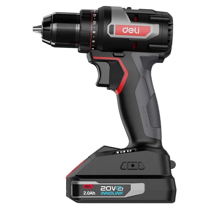 • The Deli EDE-DZ20-1D2 20V Cordless Drill delivers precise and reliable performance for a variety of tasks. It features a 10mm chuck, dual-speed control (0-450 RPM and 0-1800 RPM), and 20+1 adjustable torque settings for versatile applications. Its lightweight, ergonomic design ensures comfort during extended use, and the heat management system provides durability. Comes with 2x 2.0Ah batteries, a fast charger, and a convenient carrying case.