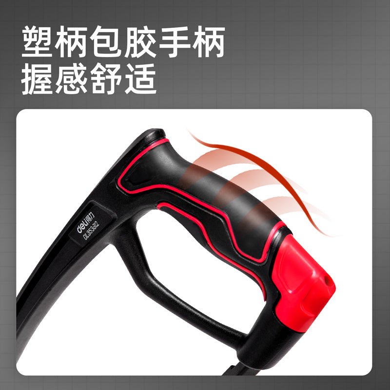 • The Deli Heavy-Duty All-Aluminium Saw Frame DL353812 offers superior durability and precision for professional and hobbyist tasks alike. Crafted from robust all-aluminum, this hacksaw frame is designed to withstand the rigors of frequent use. Its 12″ blade is ideal for cutting through a variety of materials such as wood, plastic, aluminum, copper, and stainless steel, ensuring versatility across projects. The saw’s ergonomic design includes a plastic rubberized handle, providing a comfortable and secure grip, which minimizes fatigue during prolonged use. This tool’s high compatibility and efficient blade change mechanism make it an indispensable addition to any tool collection.