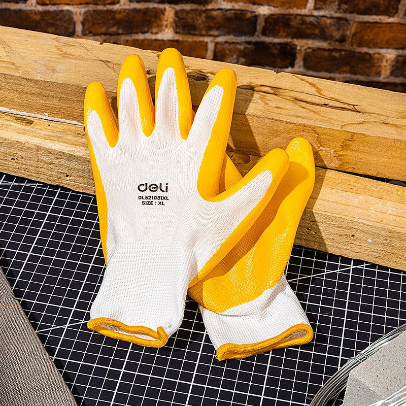 • The Deli Nitrile Gloves, model EDL521031XL, offer superior hand protection for workers in less oily environments. These gloves combine durability with comfort, utilizing a high-grade polyester shell and a nitrile-coated palm. The smooth and rough-texture palm finish enhances grip and handling precision. Sized XL, these gloves ensure a secure fit, making them ideal for various industrial applications where dexterity and protection are key.