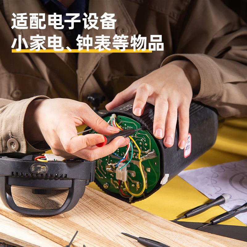 • The Deli DL240006 Precision Screwdriver Set is designed for meticulous repair tasks. This set includes six precision screwdrivers: two Philips (PH0, PH00) and four slotted (1.4mm, 2.0mm, 2.4mm, 3.0mm). Crafted from Cr-V steel with a black finish, these screwdrivers feature a hardened surface for durability. The rotating tail cap allows for easy handling, making this set perfect for delicate electronic repairs, small appliances, and clocks.