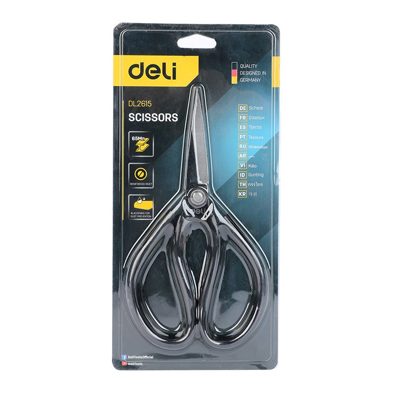 • The Deli Scissors 200mm are designed for robust cutting tasks, providing both durability and precision. These scissors are made from high-quality 65Mn steel, known for its strength and resilience. The blades undergo high-temperature quenching, which enhances their hardness and cutting efficiency. Additionally, the blackened finish prevents rust, ensuring long-term performance. The reinforced rivet adds to the overall sturdiness, making these scissors suitable for various heavy-duty applications. The 200mm size offers a comfortable grip and easy maneuverability.