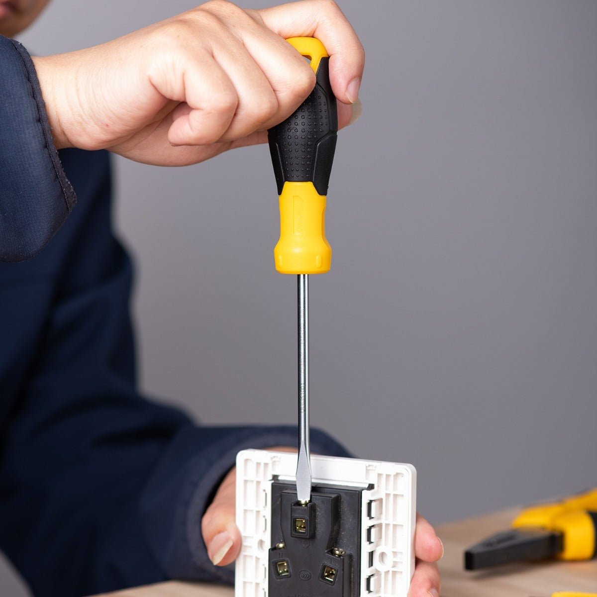 • Introducing the Deli Slotted Screwdriver 5x100mm – a must-have for both DIY enthusiasts and professionals. This screwdriver boasts a chrome-plated Cr-V steel blade for unmatched precision and durability. The two-color handle is ergonomically designed with a rubber-plastic bi-material, ensuring a comfortable grip and resistance to slip, scratch, and grease. Featuring a strong magnetic tip for easy screw handling, anti-rotation bumps to prevent rolling, and a matte-finished shank to avoid reflection, this tool embodies functionality and quality. The engraved shank offers easy management by displaying material, model, and spec details clearly.