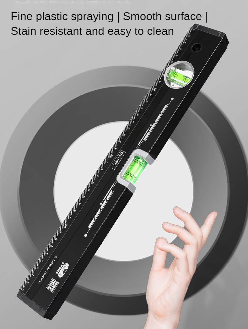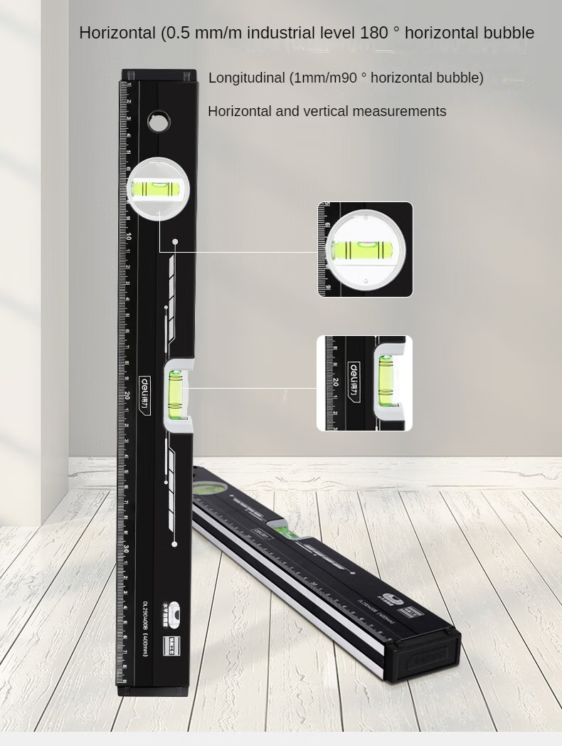 • The Deli Spirit Level, model DL290300B, is meticulously engineered to provide precise measurements across multiple applications. This 300mm spirit level is equipped with a high-accuracy horizontal vial, achieving 0.5mm/m accuracy. It features CNC fine milling for a perfectly flat surface, ensuring reliable and accurate readings. The spirit level is constructed with a robust aluminium body, enhanced with a thickened cover on both ends for impact and shock resistance. Clear scaling on the body allows for easy lineation and measurement, making it an indispensable tool for both professional and DIY projects.
