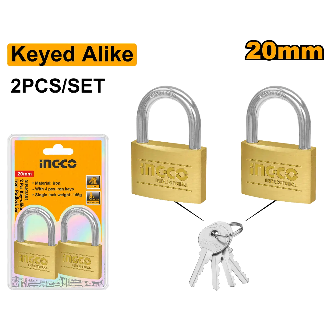 Discover the reliability of INGCO’s 20mm Brass Padlock Set, a practical solution for safeguarding your belongings. This set includes two padlocks made from solid brass, ensuring long-lasting use and resistance to weather and corrosion. The identical keys offer ease of use, making them ideal for multiple locks. Whether securing lockers, gates, or toolboxes, this padlock set provides peace of mind with its sturdy construction and precise locking mechanism.