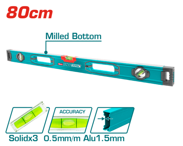 • The TOTAL TMT28028 aluminum level is used in construction and finishing works to determine the flatness of a surface. Its robust construction and high precision make it ideal for professional and home use. This level is designed to provide accurate readings with a precision of 0.5 mm/m, ensuring that all your projects are perfectly aligned. Its 800 mm length allows for versatile applications, from measuring small surfaces to handling larger construction tasks. Built with durable materials, this tool is made to withstand regular wear and tear, providing long-lasting reliability. The TOTAL TMT28028 level is an essential tool for any toolbox, offering ease of use and exceptional accuracy.