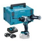 The Makita DHP486RTJ stands as a top-of-the-line combi drill designed for heavy-duty applications. This brushless model ensures efficient power management and longevity. It offers up to 141 Nm of torque and a no-load speed of 2,100 rpm, enabling quick and powerful drilling, hammer drilling, and screwdriving. Its compact 178 mm head length facilitates operation in tight spaces. The kit includes two 18V 5Ah Li-ion batteries, a fast charger ensuring a 45-minute charge time, a durable MakPac case, a side handle, and a depth stop for precision work. Equipped with Extreme Protection Technology, it’s engineered to resist dust and moisture in harsh conditions.