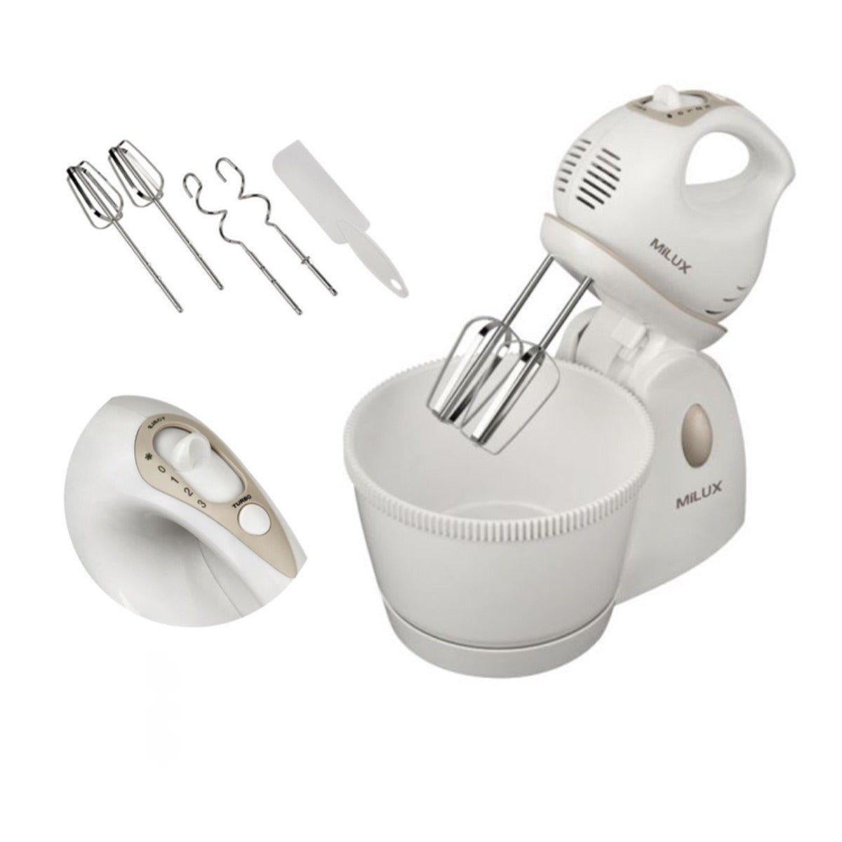 • The Milux MSM-9901 is a 2-in-1 stand mixer designed to provide both efficiency and versatility for your kitchen tasks. With a 200W motor, this mixer handles a variety of ingredients with ease. It features a 2.5-liter capacity mixing bowl that is gear-driven for reliable and consistent performance. The mixer includes several accessories such as a beater whisk, dough hooks, and a spatula, making it ideal for mixing, whipping, and kneading.