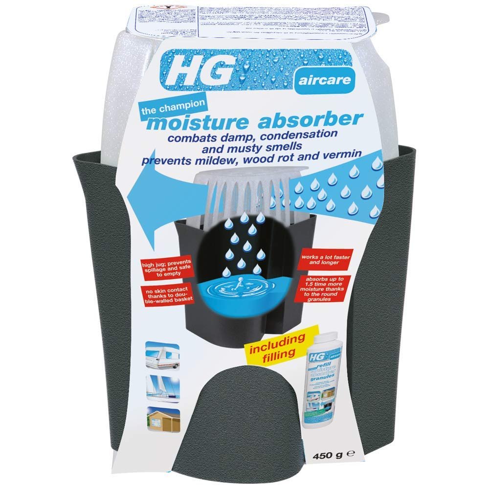 HG moisture absorber basket: designed to reduce the humidity in damp rooms & indoor spaces by absorbing excess moisture, to improve the air quality. Ideal for the home or in outhouses, vehicles & more anti damp: this moisture trap refill reduces the humidity in damp areas to an acceptable level & is great for sheds, caravans, boats, garages, gyms, cellars, wardrobes, bathrooms or other rooms avoid mold, mildew & musty smells: prevent the harmful consequences of too much humidity, such as condensation, smells, mold, damp patches, vermin & wood rot. Tall to prevent spilling & pours safely absorb up to 1.5 times more humidity: thanks to the round granule shape. Does not mask smells but tackles the source. Helps to freshen the air & balance room moisture levels in the home easy to use & long lasting: pour the moisture trap granules into the basket & replace the lid. Put the moisture absorber trap back in its place. No skin contact with double-walled basket design.
