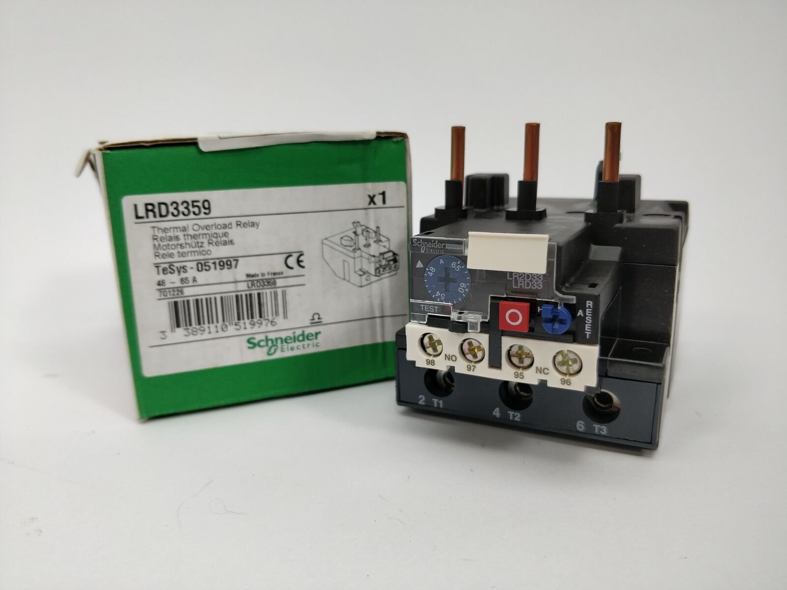 • TeSys LRD thermal overload relay, 65A/690V, thermal setting range48 A – 65A A, tripping class 10A, for protection of 3-phase motors less than 0.06kW@400V. Differential device with phase failure (loss).
