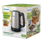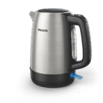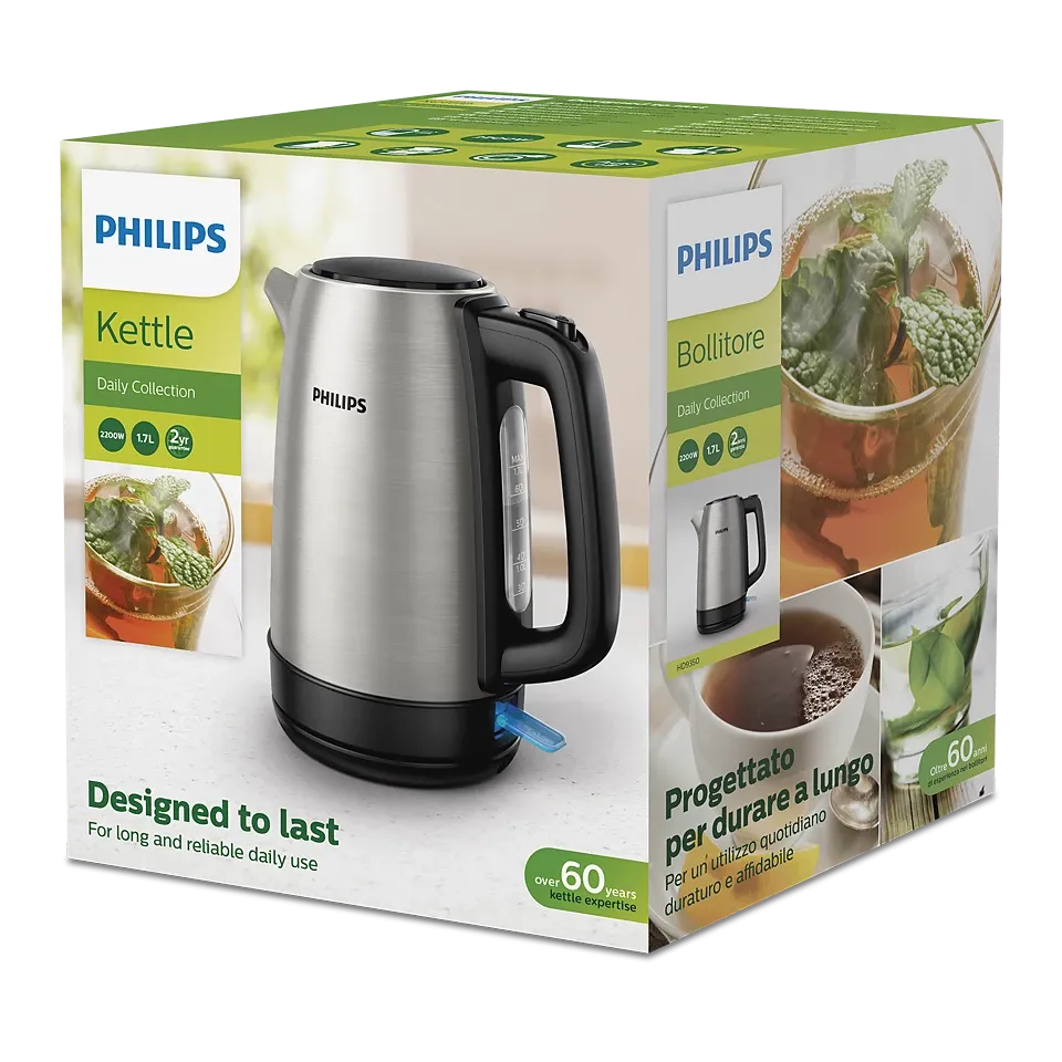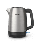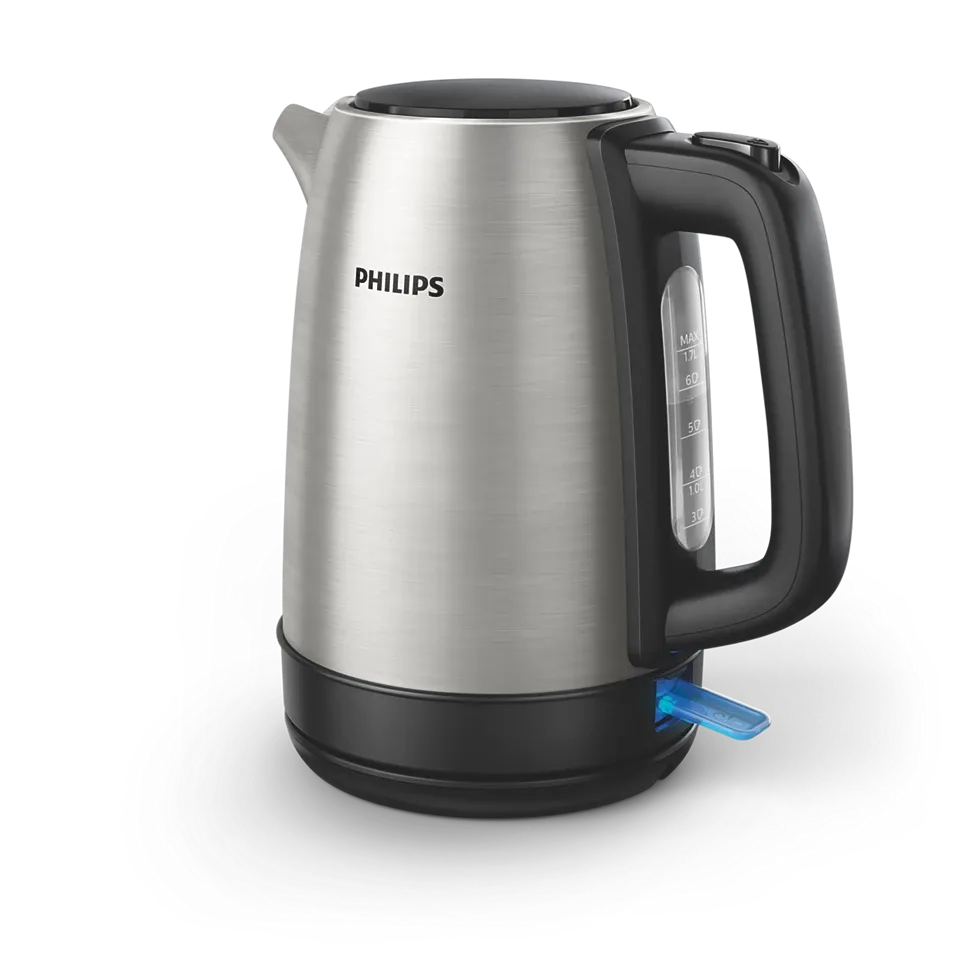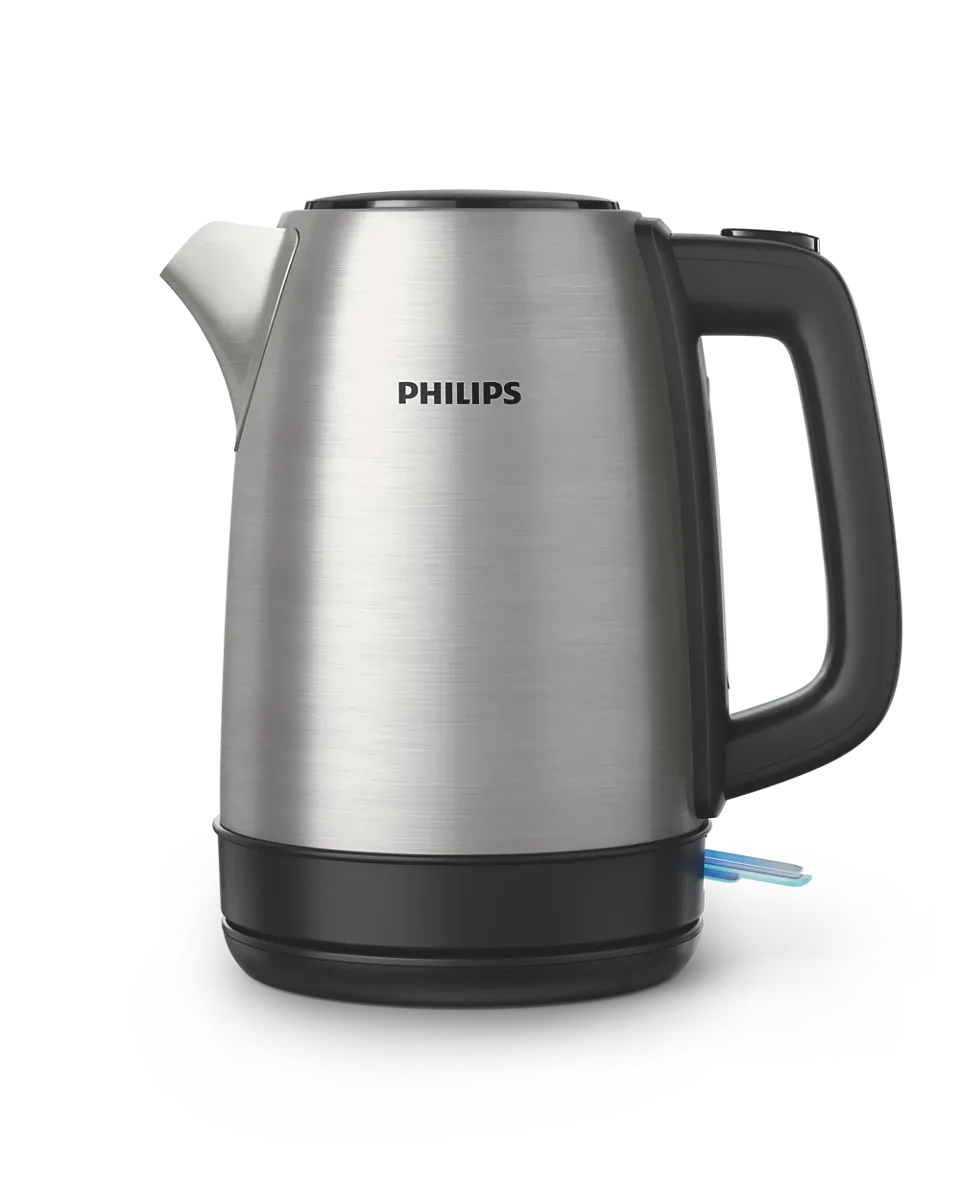 • The Philips Daily Collection Metal Kettle is crafted from food-grade stainless steel for longevity and reliability. With a 1.7-liter capacity, this kettle features a flat heating element for rapid boiling and an efficient micro-mesh filter that traps limescale. Its spring lid allows easy refilling and cleaning, while the 360° cordless base provides convenient handling. Boil-dry protection, automatic shut-off, and a pilot light indicator ensure safe operation. The one-cup indicator promotes energy-saving by allowing users to boil only the required amount of water.