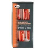 • The Retta RTS0604 Screwdriver Set is a versatile, high-quality toolkit featuring six pieces designed for durability and precision. Each screwdriver in this set is made from chrome vanadium steel with a polished chrome finish, providing enhanced resistance to corrosion and wear. The set includes three slotted and three Phillips head screwdrivers, each crafted with precise measurements to ensure a secure fit for a wide range of screws, making it suitable for both professional and household tasks. The ergonomic handles, made from durable cellulose acetate, ensure a comfortable grip and reduce slippage during use.