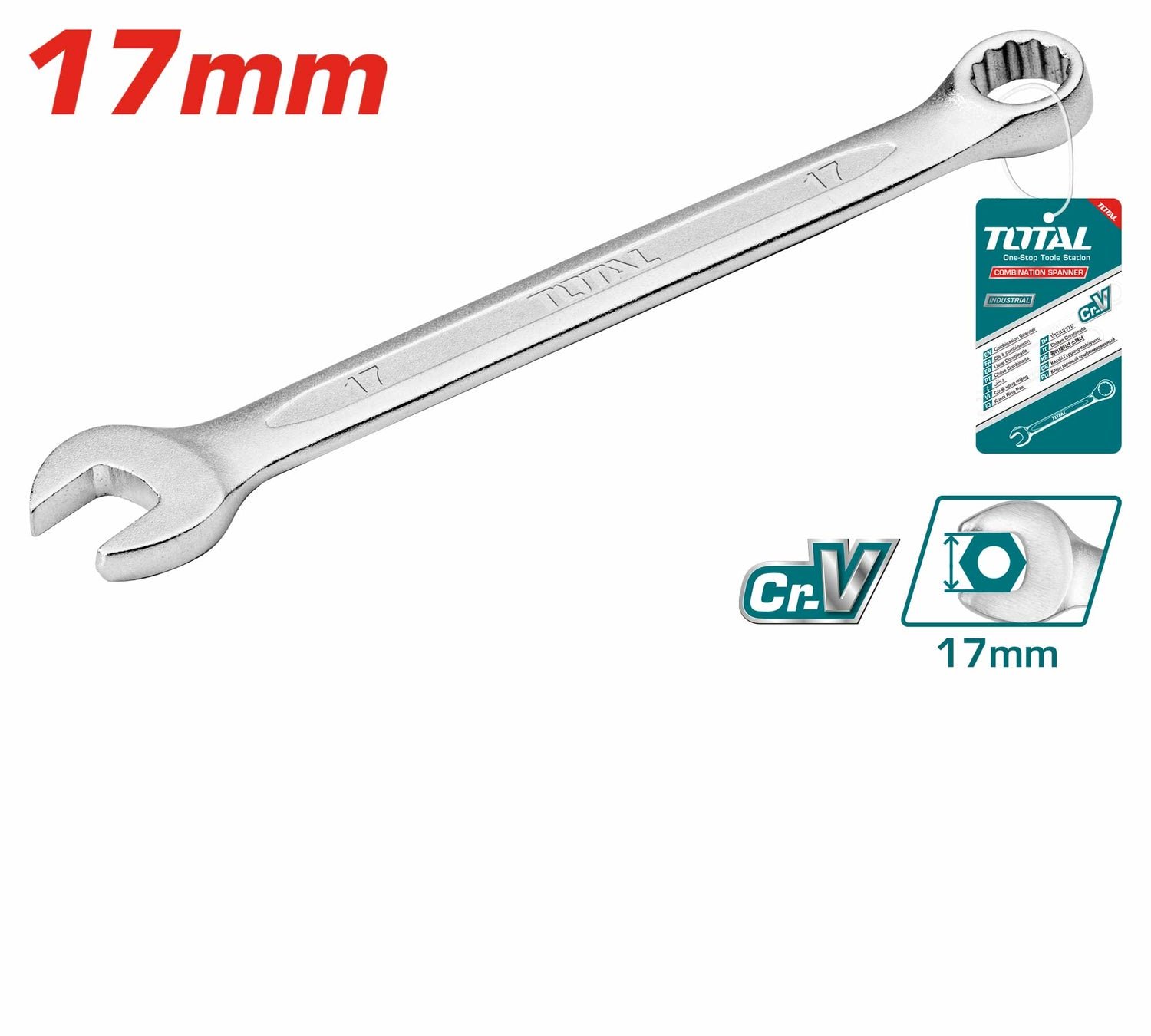 • High-quality 17mm combination spanner made from Cr-V steel, ideal for industrial use.