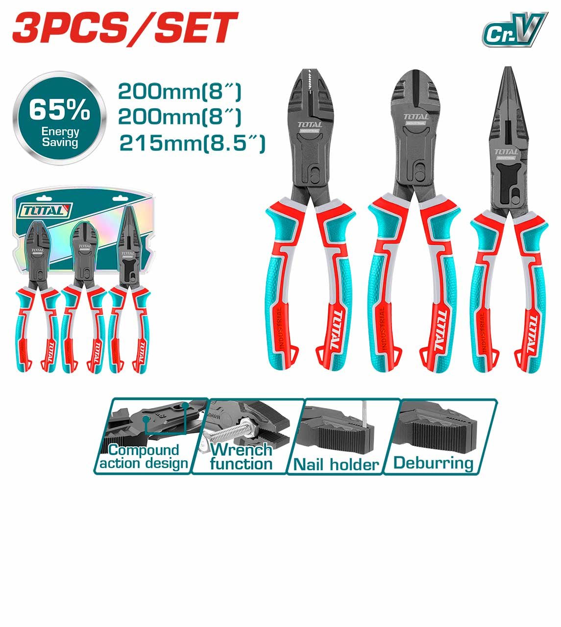 Versatile 3-piece pliers set with compound action for reduced effort. Durable Cr-V steel with comfortable TPR handles.