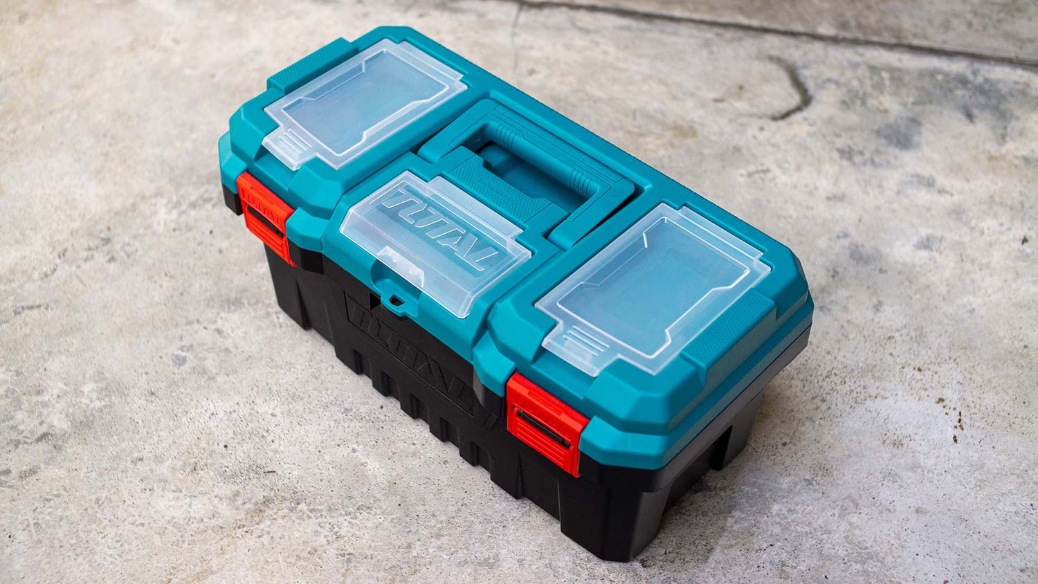 Durable and secure plastic tool box with removable tray, suitable for professional and DIY use.
